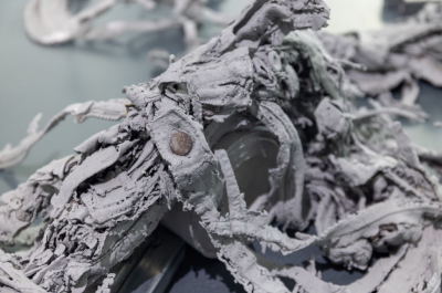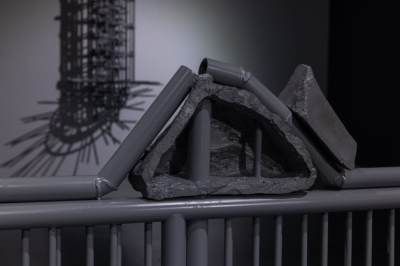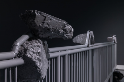 何岸的创作媒材带有一种工业化的冷峻感,在当代艺术中也算是非典型。在作品《下凡》中,他呈现的就是一些俯拾即是的设计和寻常物品,“活生生地”从现实生活的场景中被截取出来,在现场重新组装成引人驻足的陌生的集合。拾得之物,譬如在北京的路边捡来的一些石头和铁管,老化的表面、层叠的碎屑和恰如所期的尘垢,平添了一种考古魅力。有时候原材料还会伪装成其他材料,形成一种形式上而非内容上的孪生。仔细探察之下,这些个例的创作过程就会变得无所遁形的,而它们意义的生成则倚赖于艺术家炼金术般的奇妙改造。
