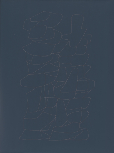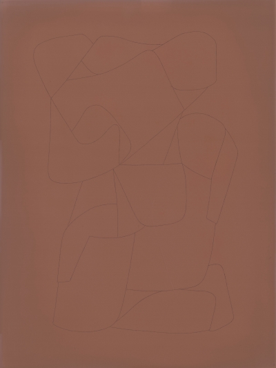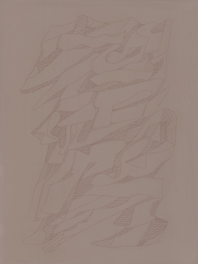 在艺术家早期的作品中,我们可以从视错觉关联到素描所形成的图式的具体所指,它们似山川、似园林、似石碑、似江河。到了近几年的创作,先是纸本设色的退场,少了体块上附着的色彩斑斓,然后体积感也逐渐淡化,那些代表着明暗的细密排线下沉到体积本身,消失不见。线描越来越精炼,线条也愈发纯粹,呈现出一种峰回路转的自信与挺拔。与此同时,线本身也在发生变化,在中早期还有一些急停、急转,似皴法的力透纸背,而现在的线少有锋利之感,线条在柔和、平缓的转折中悠然自得。这些线的丰富性不啻于形状的多样性,也在于同一根线条中的品质和内容在意想不到的变化中展开。如果说抽象图式也有等级之分,他的创作则是历经了形式抽象到纯粹抽象的历程。线条从物的边缘出发,腾空而起,吸附在纯净思维的地平线上。在这个演化过程中,线终究退回到了线本身。这一点,也可以从作品的标题上看出端倪,“四块玉”“朝元歌”“上京马”“一江风”虽道不明与画面本身的具体图式关联,但却把思想背景置于昆曲的缠绵婉转、柔漫悠远的张力之间。