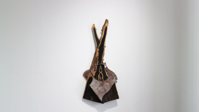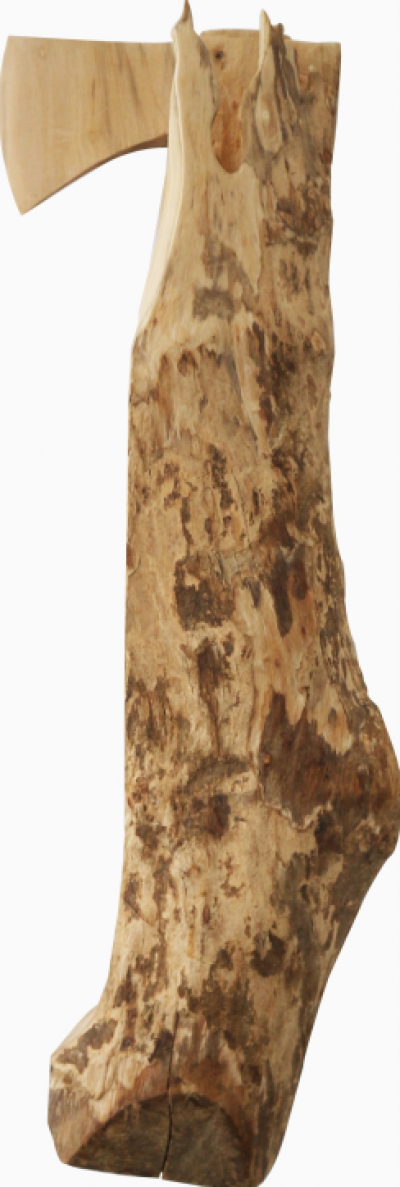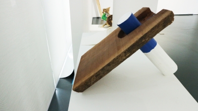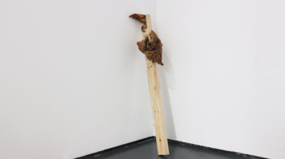 在这次展览里,金尼运用“物”与地球形成了独特的物理联系,并将它们转化为无法辨认的“结果”,创作过程既有图形倾向又具实验性。在作品系列中,有一件六百年历史的黄杨木原木,通过艺术家手持工具的改造,最终成为了“工具”—一把斧头。在另一件作品中,艺术家利用二手建筑胶合板的碎片与枫木的混合组成一个抽象的组合。他还在美术馆附近的当地村庄中发现了一种废弃橡胶速度制动器,并制成一件雕塑作品。