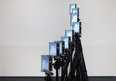 展览《参照物》中呈现的作品,是刘国强整个创作脉络的一个切片。通过四件不同形态作品,来切入他关于“静止-运动”这对关系的思考。对于一组物体是否运动的判断,是需要参照物的,物体间相互的参照关系把运动的各个主体联系在一起。在作品中刘国强设置了多层嵌套的对比。作品《参照物(装置)1#》,艺术家选择了云作为画面的主体,云本身就是一种缓慢移动但是感受上又相对静止的事物。录像中云朵极为缓慢的运动需通过前景的树作为参照物得以体现。艺术家又并置了10个内容相同但是时间线并不同步的录像,这些画面又组成了一种新的参照关系和运动感。