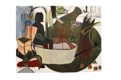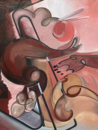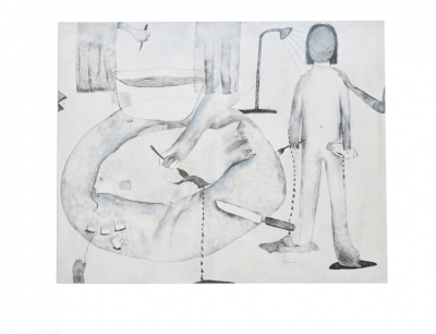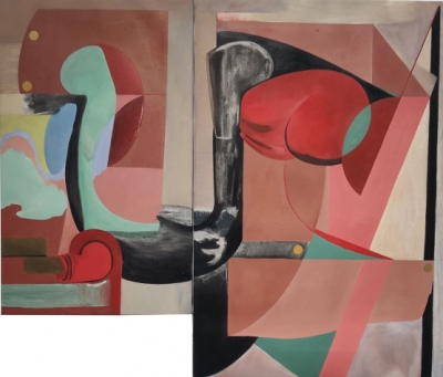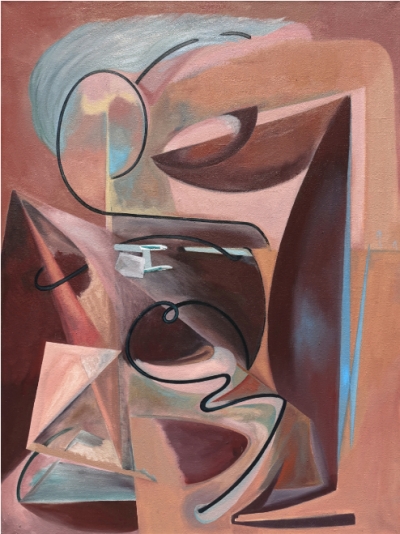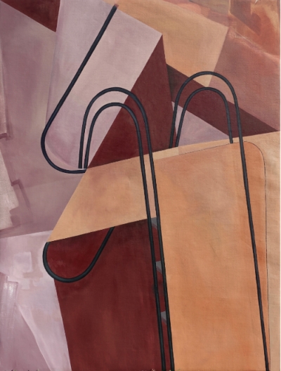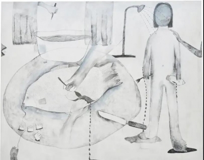 雷子艺从开始学画画的时候,可能就对结构和框架感兴趣,比较特别的是她一直在尝试着把自己心绪对外的感知,作为结构叠压弯折到她的探索结构里,这些结构分明是她生理的成长序列。比如在“没有不痛苦的浪漫”里她将自己的身体分成欲望梦幻和失落绝望两个区域,中间类似“种子”的拳形物是对正常叙述方式的卡喉,忠实于她自己的生理欲望,那些梦想不能成真的青春,还有对于现实和欲望的焦灼,都在透明和半透明的空间曲折里来回折叠、分割,有时候又变形成一只巨大的类似眼睛或者肢体。她的画面结构带着一种灼热的器官感,结构关系被一种相互摩擦重叠的半透明性指引转换成了符号语言,符号在这里又导引出潜意识对欲望的纾解。有阵子这些结构变成了她梦里莫名其妙的风景景深关系,而现在这些结构,普遍具有一定的倾斜运动方式和象征性符号语言互为呼应,每一张画里的架构空间代表她自己对具体经验的情绪感知。那些牵挂拉扯来回的线,像她身体和情绪生理路径,有时候长绵不知所去有时候又被突然截断戛然而止,这些复行于结构框架之外的线,成了它自己从结构式出发的匿踪之径,让清晰灼热的框架变得支离和不可知。