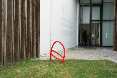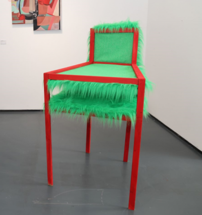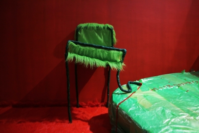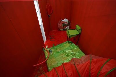 晓彤这次驻地的方案延续了去年毕业创作的红绿装置系列,依然是被改造过的椅子和日常物。今年的不同是增加了一个装置外部的围墙,一个观看的限制。她设置了三个可以窥视的长条形缝隙,宽度和人脸差不多,比头稍窄。简而言之,观众进不去。强烈的红绿对比赋予那些平常之物一种魔力的童话气质,再加上塑料包装、网袋、气球、织物、反光贴纸等等“横七竖八”的出现在空间里,这些看起来就有种神经质的材质,提示晓彤曾经幻想过的另一个世界——一个金鱼缸里的金鱼的生活——她的另一个作品,一部定格动画,创作于2019年。这样的一个怪诞空间,发生任何事情都是可能的——恐怕这就是晓彤想让观众在缝隙里窥视到的,仿如似有亦无的,不可触碰的“Peter Pan”的“Neverland”。