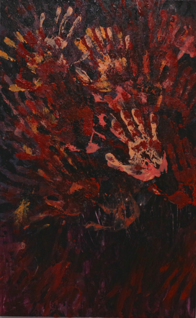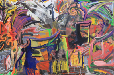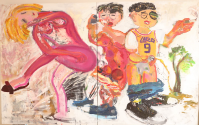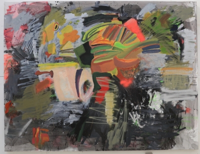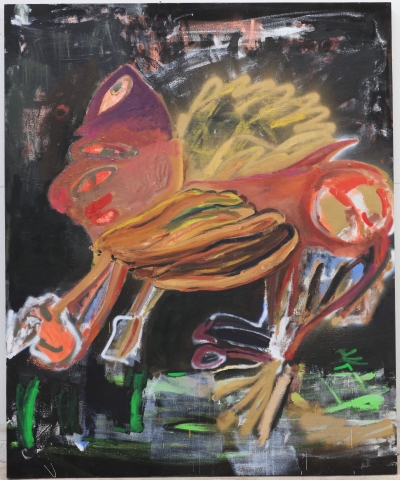 展览空间原来是板式家具厂,几百平没有柱子干扰视线,一览无余,光亮晦暗,像敞开的口腔。绘画容易被这样的空间吞吃掉。刘嘉宇把画挂墙上,高度不整齐。或者直接靠墙放画。据说,巴斯奎亚做第一个展览时,也这么布展。他的丙烯绘画有涂鸦的痕迹,又像是从暗色底子渐渐提亮的——那是文艺复兴时期意大利人常用的油画方法,常被称为“古典”的。他的绘画结构是松散的。形象和色彩是胶着的关系,彼此牵扯,不分主次。他的绘画永远在流动,在沸腾,特别欢快,又布满神经质的惊慌、疼痛与怀疑。画奇妙地与废弃厂房相处,谁跟谁也不打架,谁也没失去自己的性格。空间和艺术,都自在得很。
