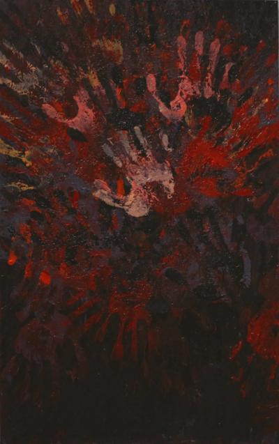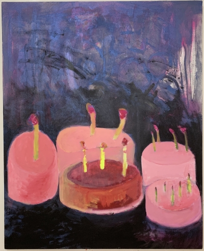新展“颜料在缩短”在顺德开幕,我估计难以成行了。原本他要展上海的画,现在换作存于北京的,恰好我都看过,就来写点什么。看画这件事,要求观众亲身在场,那是因为绘画的照相在PDF的超高清扫描里,怎么都比不过一个阴霾的下午,坐车到一处没去过的地方,看一些没有见过的画。绘画是一位画家面对虚空,发起舞蹈般的行动。等绘画留下,舞步结束并藏匿起来,我们还可以通过画布上的痕迹去猜想他的行为。荧屏显形的平面,由像素组成,记录不下操作时疾徐厚薄的变化。刘嘉宇绘画时,表达意向强烈。我记得他那幅《蛋糕》,弯曲的蜡烛被点燃,摇曳在五个粉红色的饼体上。变形的蛋糕像是漂浮在混沌的背景间,又像在被这混沌挤压。伴随漂浮与挤压,观赏的眼睛能附和他业已消失的手舞足蹈,能看到那活泼舞蹈的消逝。