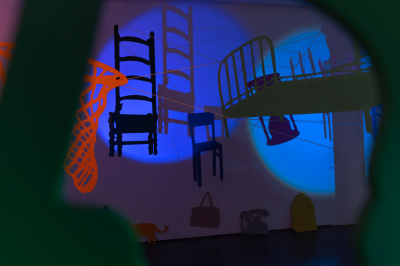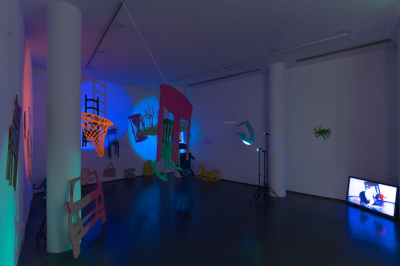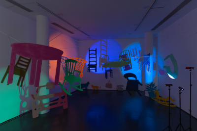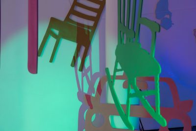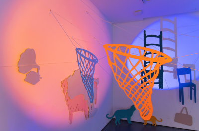 在本次驻地创作的进程中,艺术家沿用了负型木板与色块搭配的创作手法,各类具有象征意义的符号被悬吊在美术馆的展厅之中,组成了具有街头文化基因的“浮雕”。展览场域犹如一场舞台剧的“幕后”,观者亦可自由穿行其中,用身体感受不同角度带来的视觉体验。在“正面”,纯色块的形式组合对视域更加开放;而在“反面”,观者仅能通过某个特定角度来凝视符号的组成。